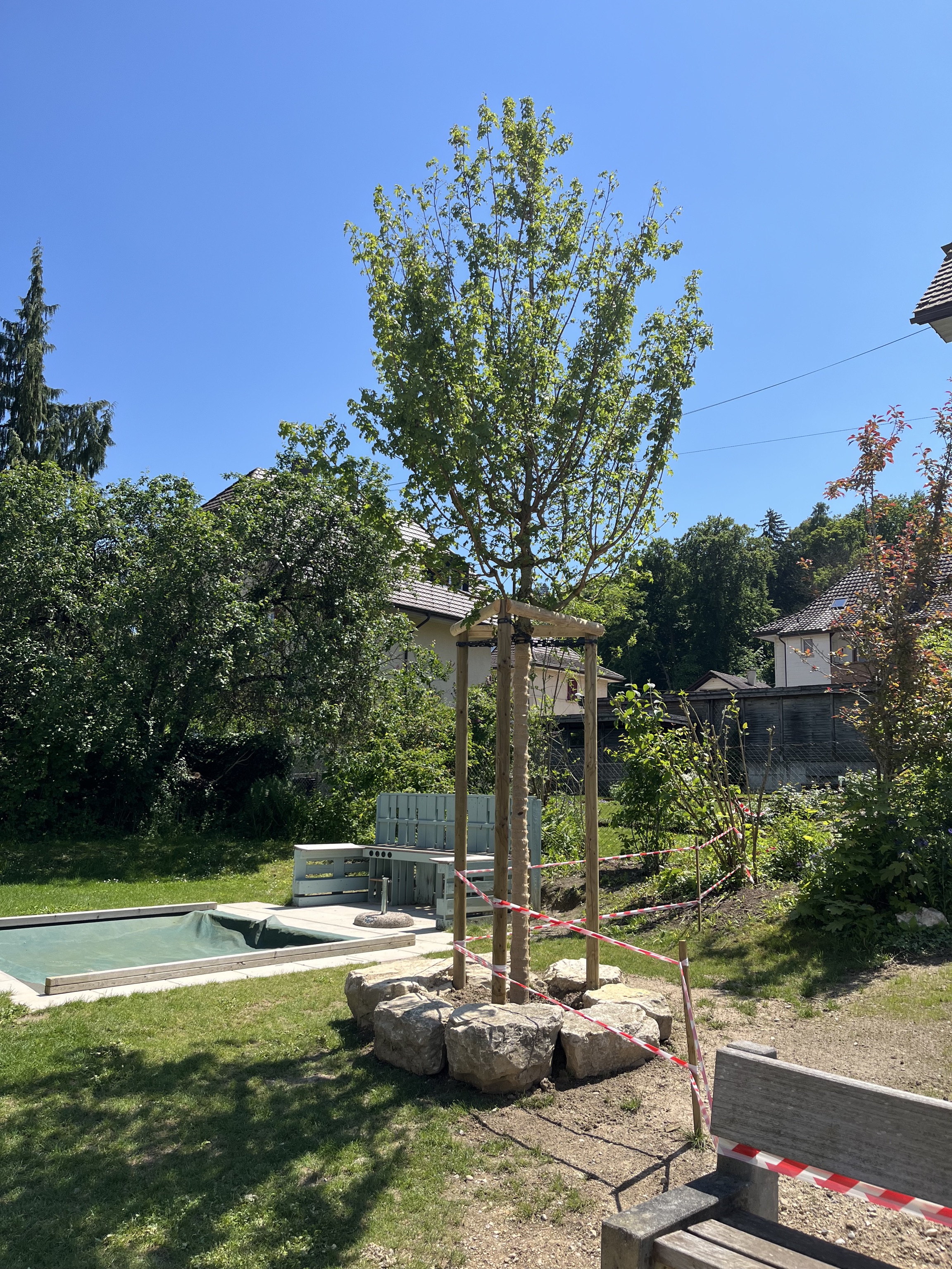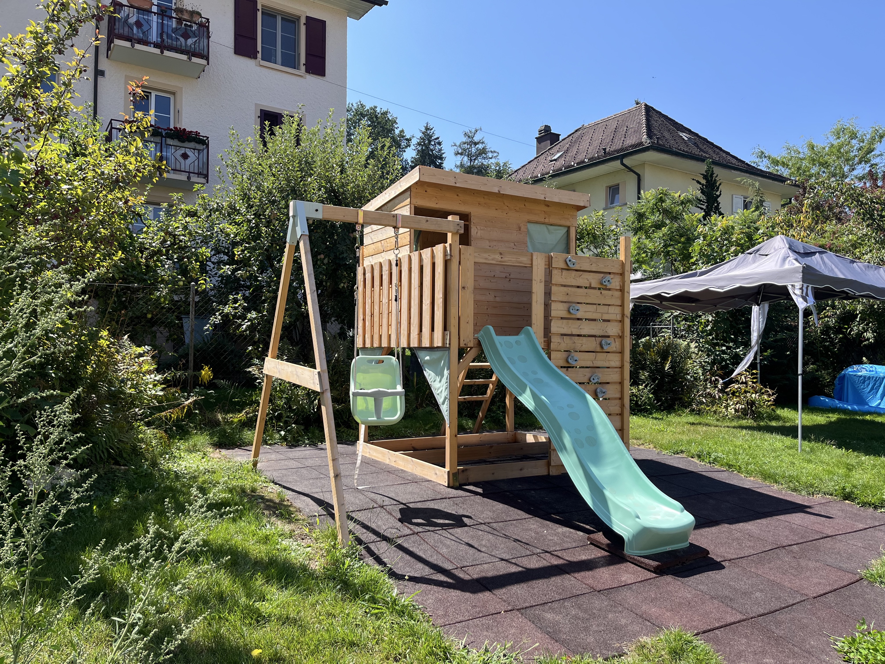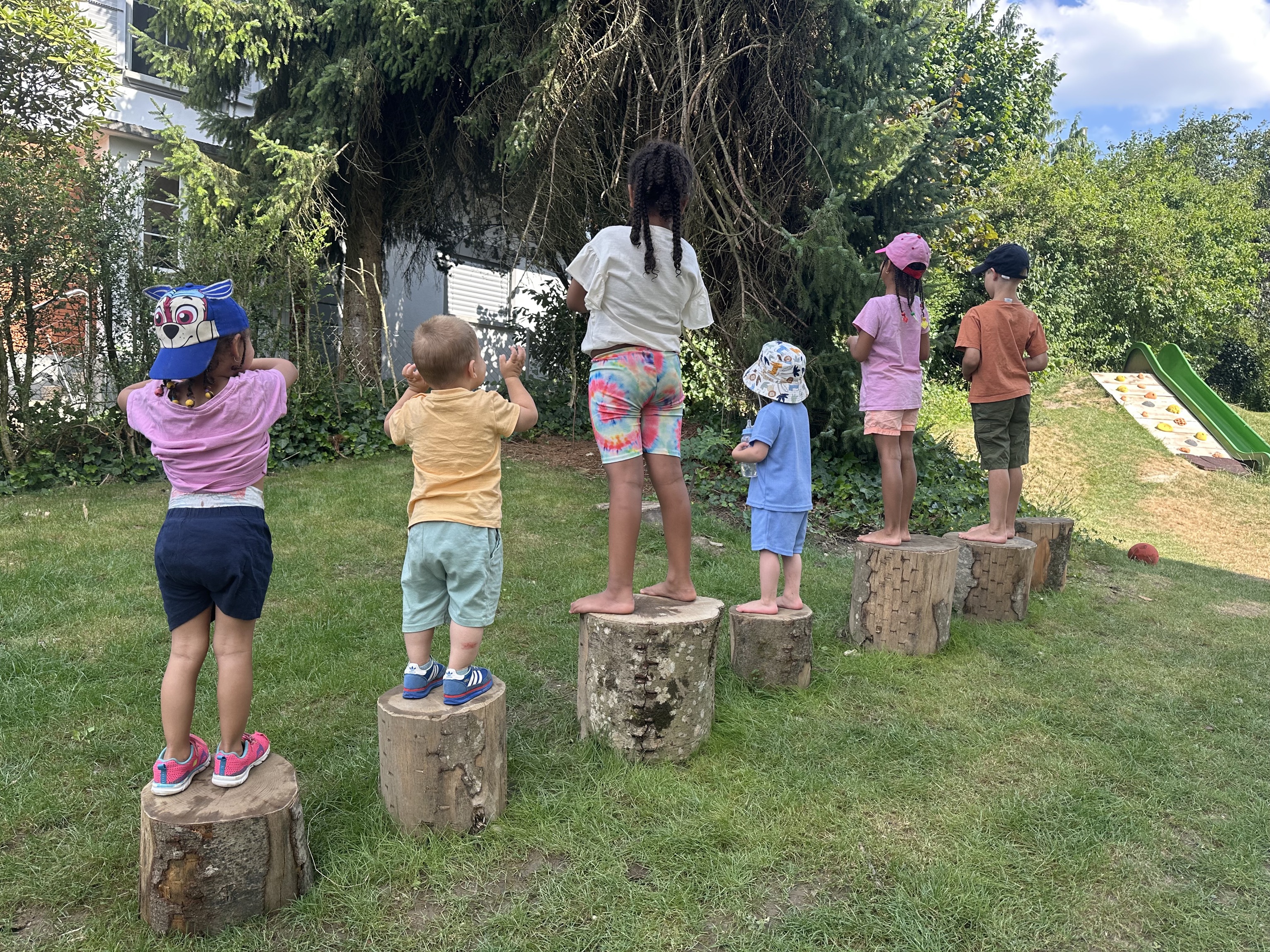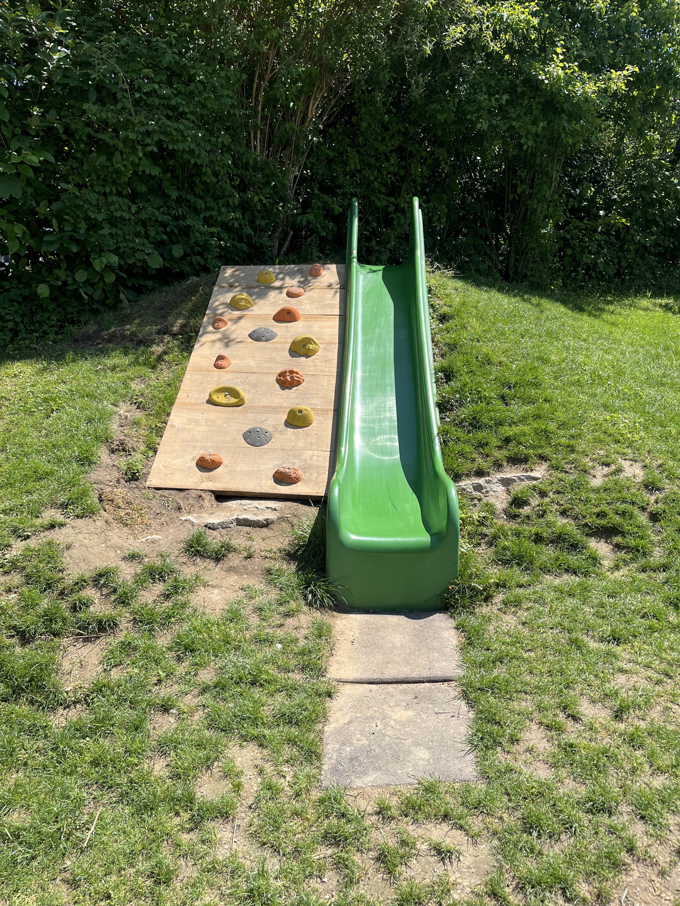 Wir haben unseren Garten umgestaltet und freuen uns riesig über das neue Spielgerüst, die Baumstämme zum Balancieren, den neuen Schatten-Baum und die Kletterwand neben der Rutsche.